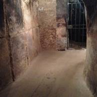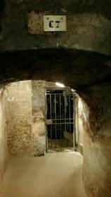 You can see the old arms bins that now hold wine bottles here in the first picture. The second picture shows where the three fake walls were placed during the German occupation of this region during WW2. They have four fake walls constructed to conceal some of the oldest bottles from the Germans. The third shot is a wall demonstrating just how thick the construction is.